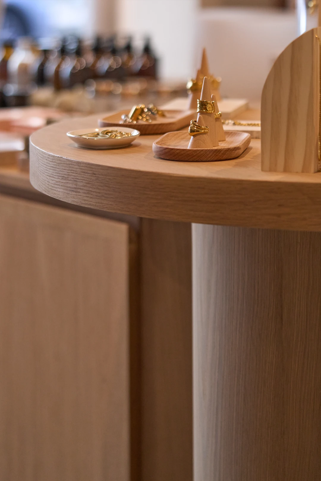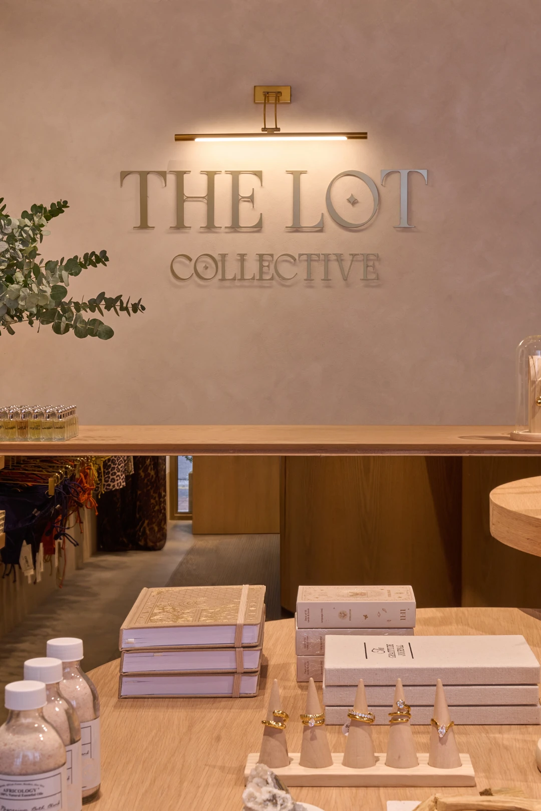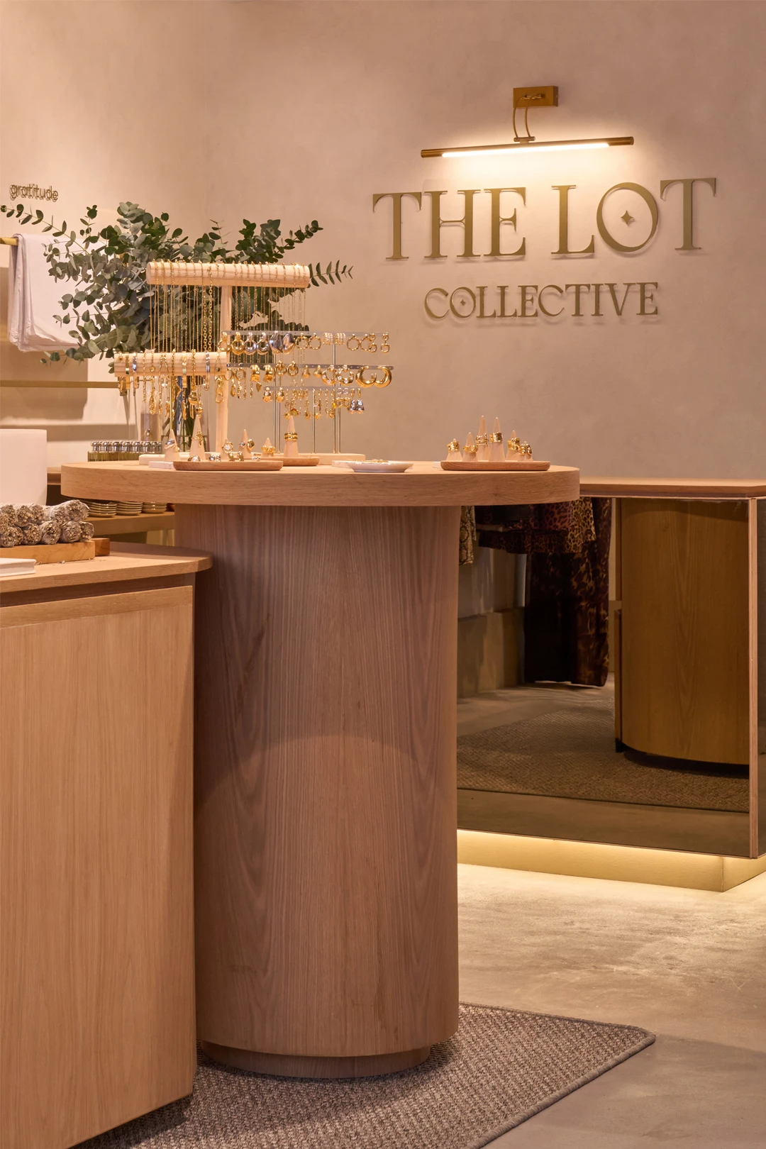 Our design for The Lot Claremont blends the natural warmth of wood with refined brass finishes, to create a timeless, sophisticated retail atmosphere that celebrates indivduality.
